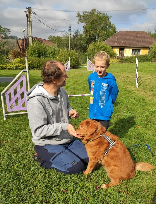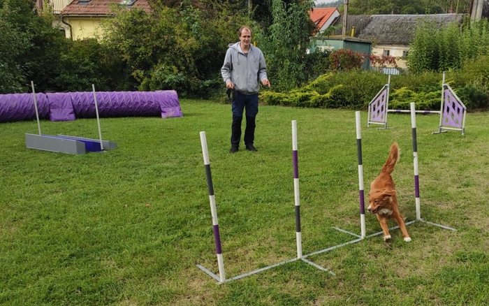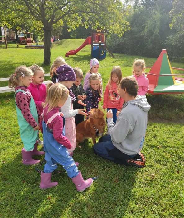 Agility - ukázka sportu se psy. Děkujeme panu Pupíkovi za návštěvu naší MŠ.