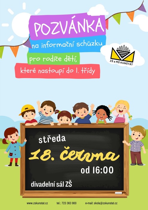 Zveme rodiče budoucích prvňáčků na setkání s třídními učitelkami. Dozvíte se všechny důležité informace před nástupem Vašeho dítěte do školy. Těšíme se na Vás!