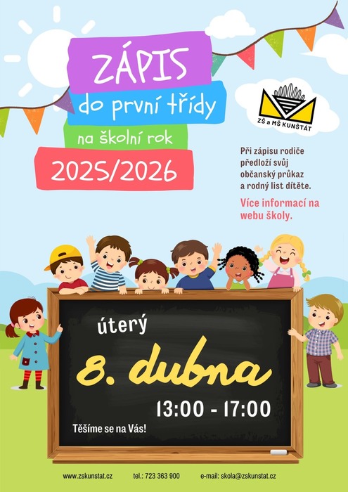 Základní škola a Mateřská škola Kunštát oznamuje rodičům žáků, kteří nastoupí ve školním roce 2025/2026 do 1. ročníku ZŠ, že termín zápisu je stanoven na úterý 8. dubna 2025 od 13.00 do 17.00.